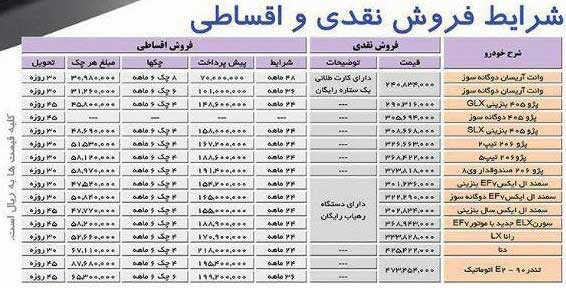 انواع شرایط فروش نقدی و اقساطی محصولات ایران خودرو به شرح زیر جداول زیر است: