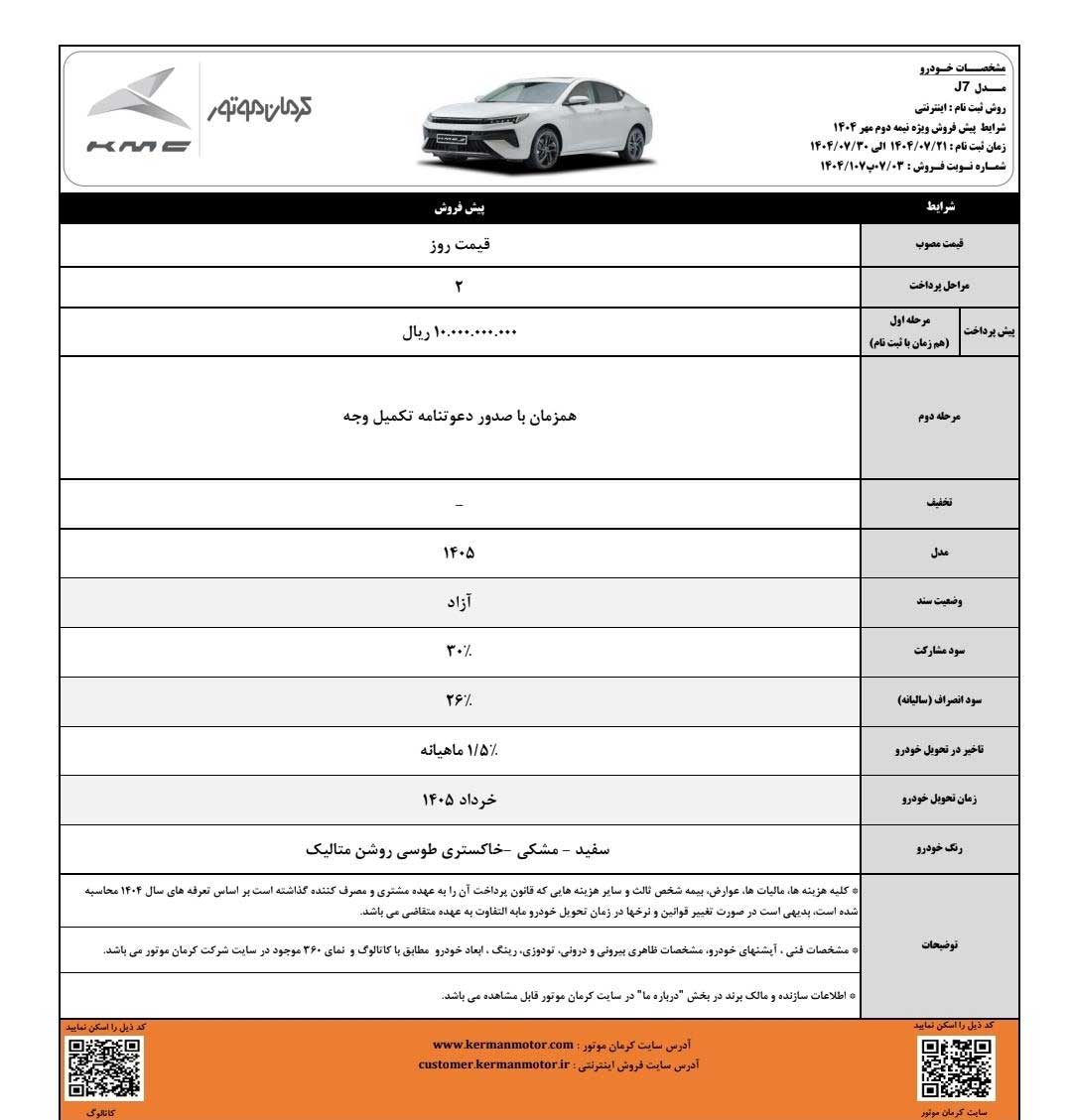 شرکت کرمان موتور شرایط فروش کی ام سی J7 را اعلام کرد.