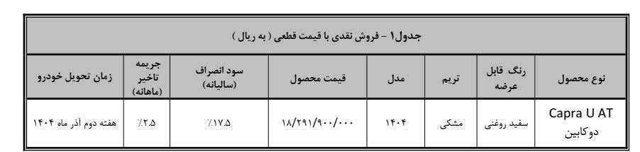 در این طرح، محصول کاپرا U اتوماتیک دوکابین مدل ۱۴۰۴ با رنگ سفید روغنی و تریم مشکی و با قیمت قطعی ۱۸,۲۹۱,۹۰۰,۰۰۰ ریال عرضه میشود. موعد تحویل خودرو هفته دوم آذرماه ۱۴۰۴ تعیین شده است.