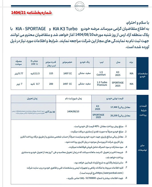 شرکت آذریوردسال در جدیدترین بخشنامه خود از آغاز فروش دو محصول جدید کیا، شامل سدان K3 مدل 2025 و کراساوور اسپورتیج 1.5 توربو ویژه منطقه آزاد ارس خبر داده است.