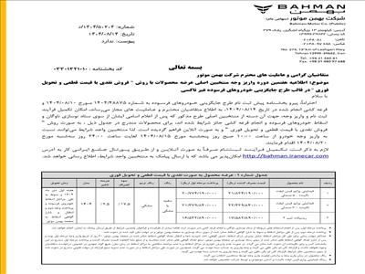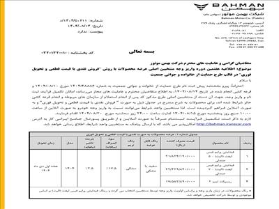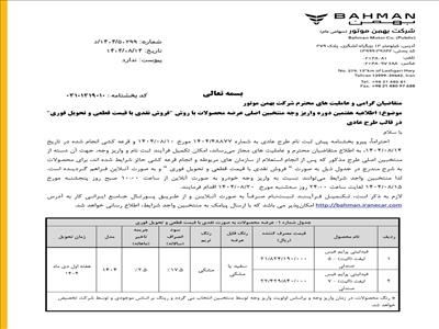 شرکت بهمن‌موتور در اطلاعیه‌ای رسمی از آغاز مرحله هفتم واریز وجه منتخبین اصلی طرح فروش نقدی با قیمت قطعی و تحویل فوری در سه قالب طرح عادی، حمایت از خانواده و جوانی جمعیت و جایگزینی خودروهای فرسوده غیرتاکسی خبر داد.