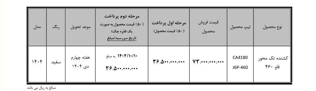 در این مرحله از فروش، کشنده فاو ۴۶۰ با قیمت قطعی ۷۳ میلیارد ریال عرضه میشود. متقاضیان باید ۵۰ درصد مبلغ خودرو معادل ۳۶ میلیارد و ۵۰۰ میلیون ریال را در زمان ثبتنام بهصورت نقدی پرداخت کرده و باقیمانده مبلغ را در قالب یک فقره چک صیادی به تاریخ ۱۰ دیماه ۱۴۰۴ تسویه کنند. موعد تحویل خودرو هفته چهارم دیماه ۱۴۰۴ تعیین شده است.