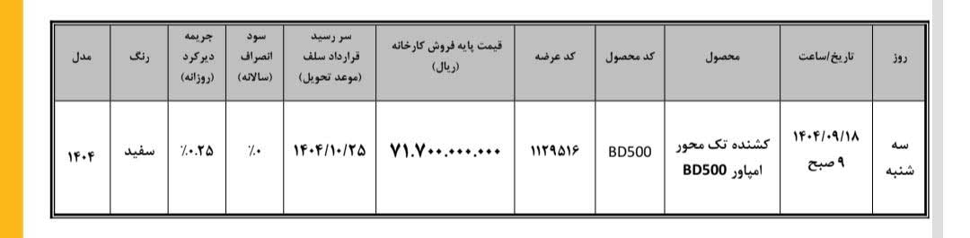شرکت بهمندیزل کشنده تکمحور امپاور BD500 را ساعت 9 صبح روز سهشنبه ۱۸ آذر در بورس کالا به فروش میرساند. محصول عرضه شده در این مرحله با رنگ سفید، مدل ۱۴۰۴ و موعد تحویل ۲۵ دی ۱۴۰۴ به مشتریان عرضه میشود.