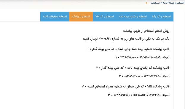 با این حال برخی اطلاعات بیمهای خودرو با ارسال یکی از فرمتهای پیامک به شماره ۳۰۰۰۲۶۱ قابل دریافت است: