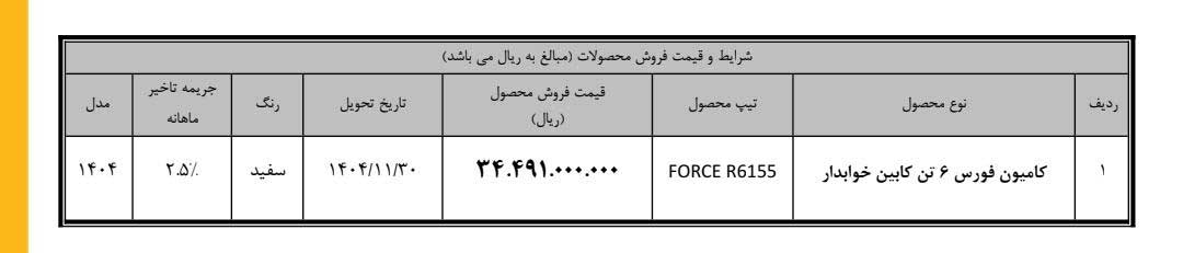 در این طرح، کامیون فورس ۶ تن کابین خوابدار به رنگ سفید عرضه میشود.