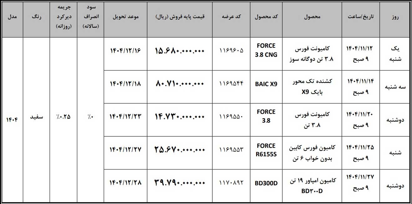 بر اساس این بخشنامه، مجموعهای از کامیونتها، کامیونها و کشندههای بهمن دیزل در بهمنماه ۱۴۰۴ و در قالب عرضه در بورس کالا در دسترس متقاضیان قرار میگیرند. تمامی این محصولات با شرایط تحویل فوری یکماهه عرضه خواهند شد.