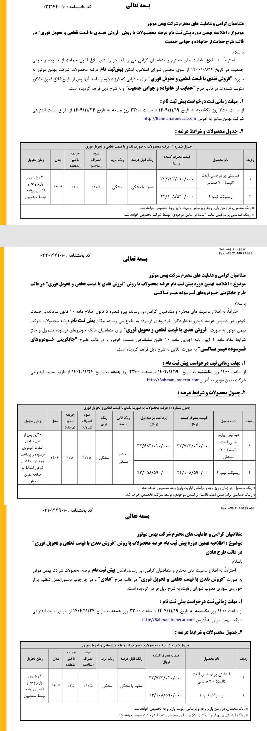 شرکت بهمن موتور بخشنامه پیش ثبت نام فیدلیتی الیت و ریسپکت با قیمت جدید را منتشر کرد.