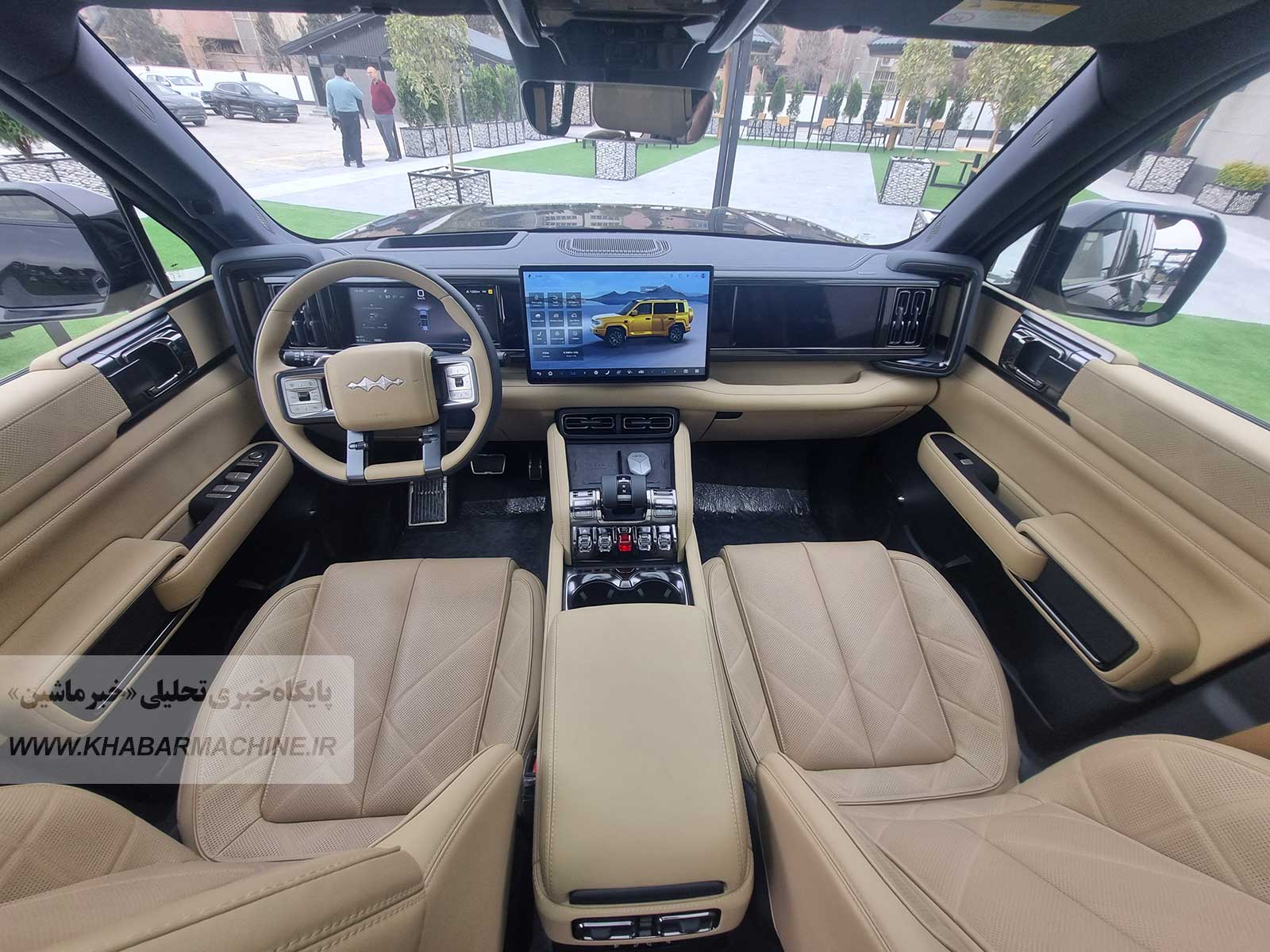 در کابین، فضای مدرن و فناورانهای شکل گرفته که با نمایشگر ۱۵.۶ اینچی مرکزی و نمایشگر ۱۲.۳ اینچی مقابل سرنشین جلو همراه شده است. صندلیهای جلو و عقب به گرمکن و سردکن مجهز هستند و صندلیهای جلو قابلیت ماساژ نیز دارند. سیستم صوتی ۱۸ بلندگو، نورپردازی داخلی چندرنگ، سقف پانورامیک سانروفدار، یخچال داخلی، شارژر بیسیم ۵۰ واتی و سیستم تصفیه هوای PM2.5 تنها بخشی از امکانات رفاهی این خودرو محسوب میشوند. افزون بر این، خروجی برق AC با توان ۶ کیلووات امکان استفاده از تجهیزات برقی در سفرهای طبیعتگردی را فراهم میکند که مزیتی کاربردی برای علاقهمندان آفرود به شمار میرود.