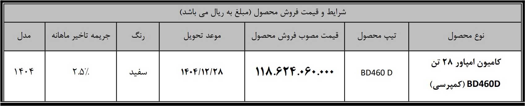 جزییات طرح فروش نقدی کامیون امپاور 28 تن BD460 کمپرسی با قیمت حدود یازده میلیارد و 862 میلیون و موعد تحویل 28 اسفند 1404 اعلام شد.