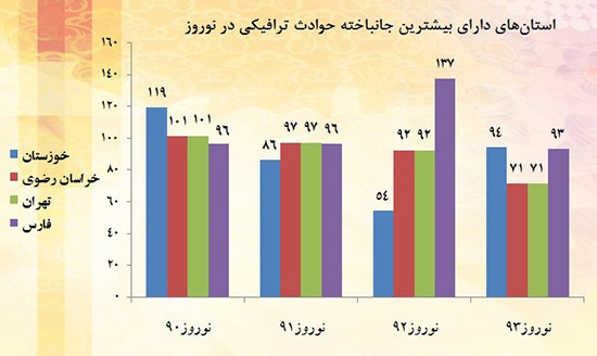 در طول چهار نوروز گذشته، استانهای فارس، خراسان رضوی، تهران و خوزستان دارای بیشترین قربانیان حوادث رانندگی بودهاند، بطوری که طی اجرای طرح نوروزی در سال 90 تا 93 در استانهای مذکور به ترتیب 422، 361، 361 و 353 تن به علت حوادث رانندگی جان خود را از دست دادهاند.